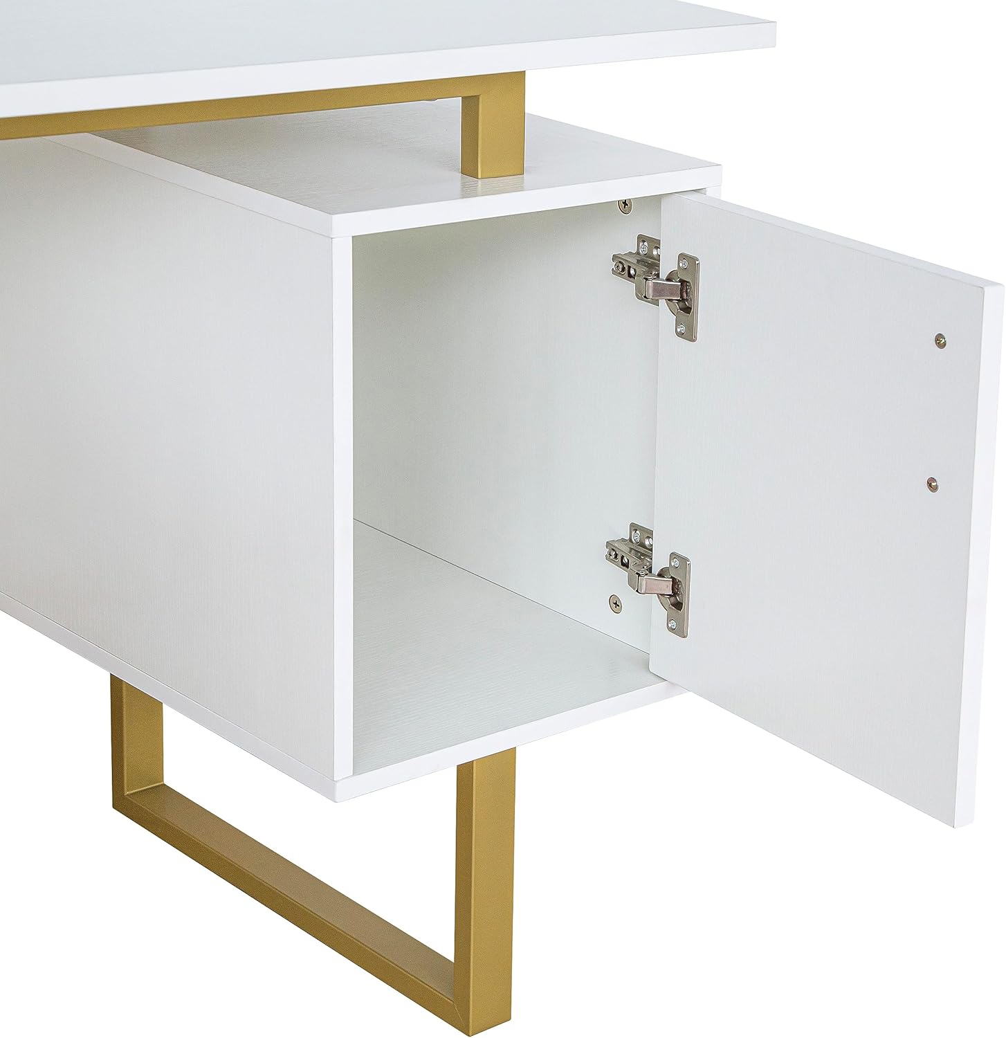 Introducing the Techni Mobili white and gold computer desk with drawers and storage cabinet. Aesthetically pleasing with clean lines, a large floating top, and gold metal track legs these office desks & workstations embody the perfect combination of function, durability, and design in modern form.