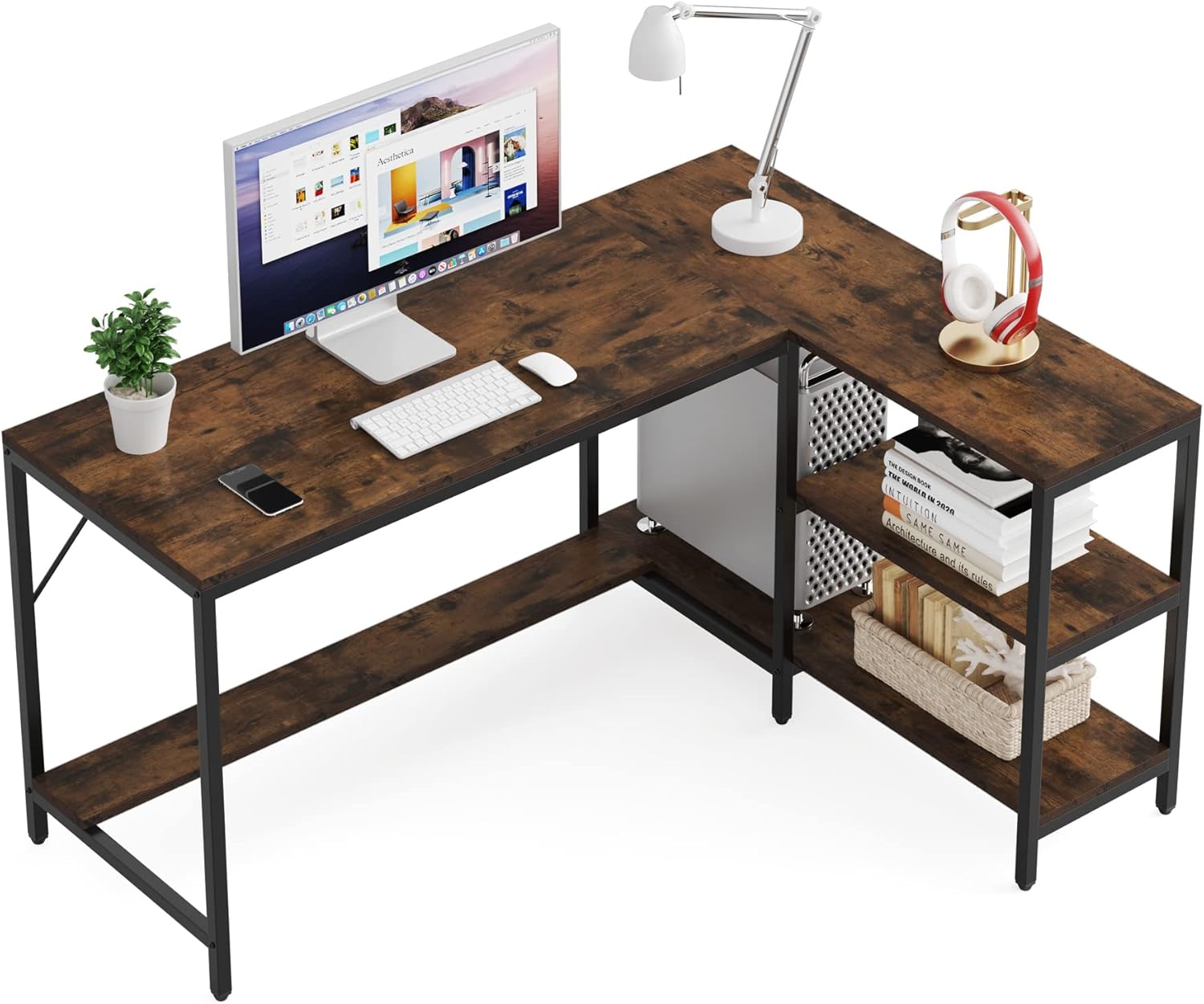 1.←?→ Left or Right? You define it! Our L shaped writing desk with reversible shelf easily meet your different need whatever you want to put the shelf on the right side or left side. It can be installed in two ways to perfectly match your room space and maximally save the space of your home office. Define your own interchangeable corner desk! ~