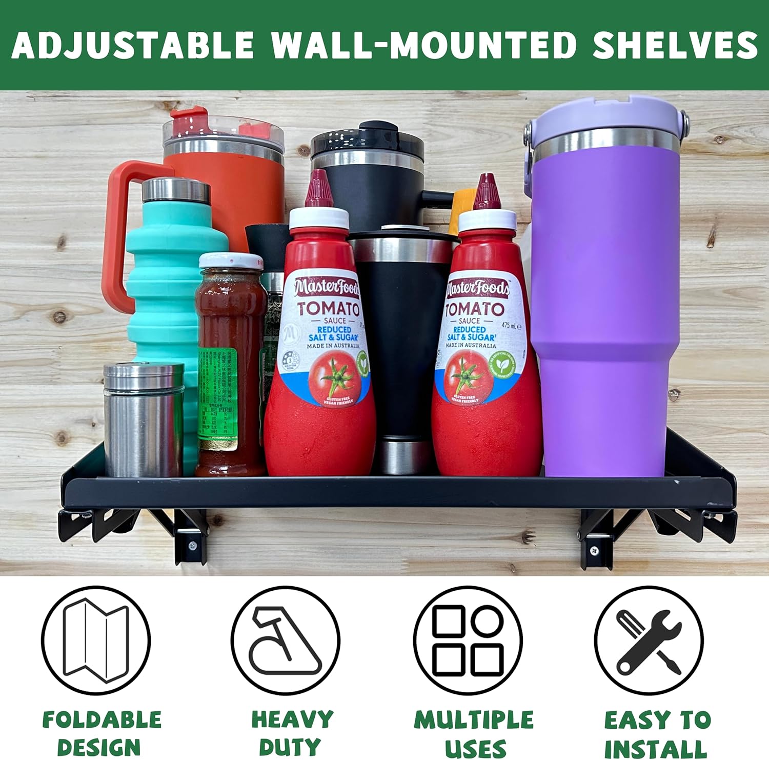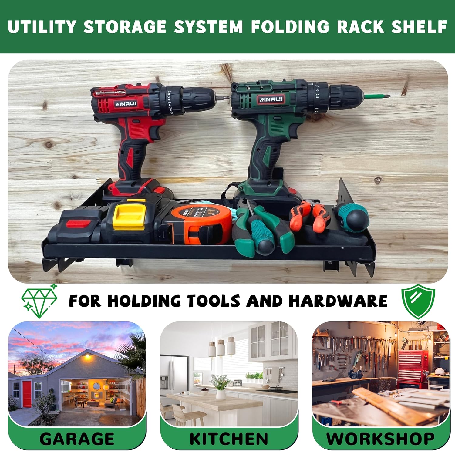 [Space Saving Adjustable Rail Shelf]: The wall mounted shelf is an ideal solution for optimizing space. Because it can easily fold flat against the wall when not needed, instantly free up valuable floor space. keeping your garage organized and tidy