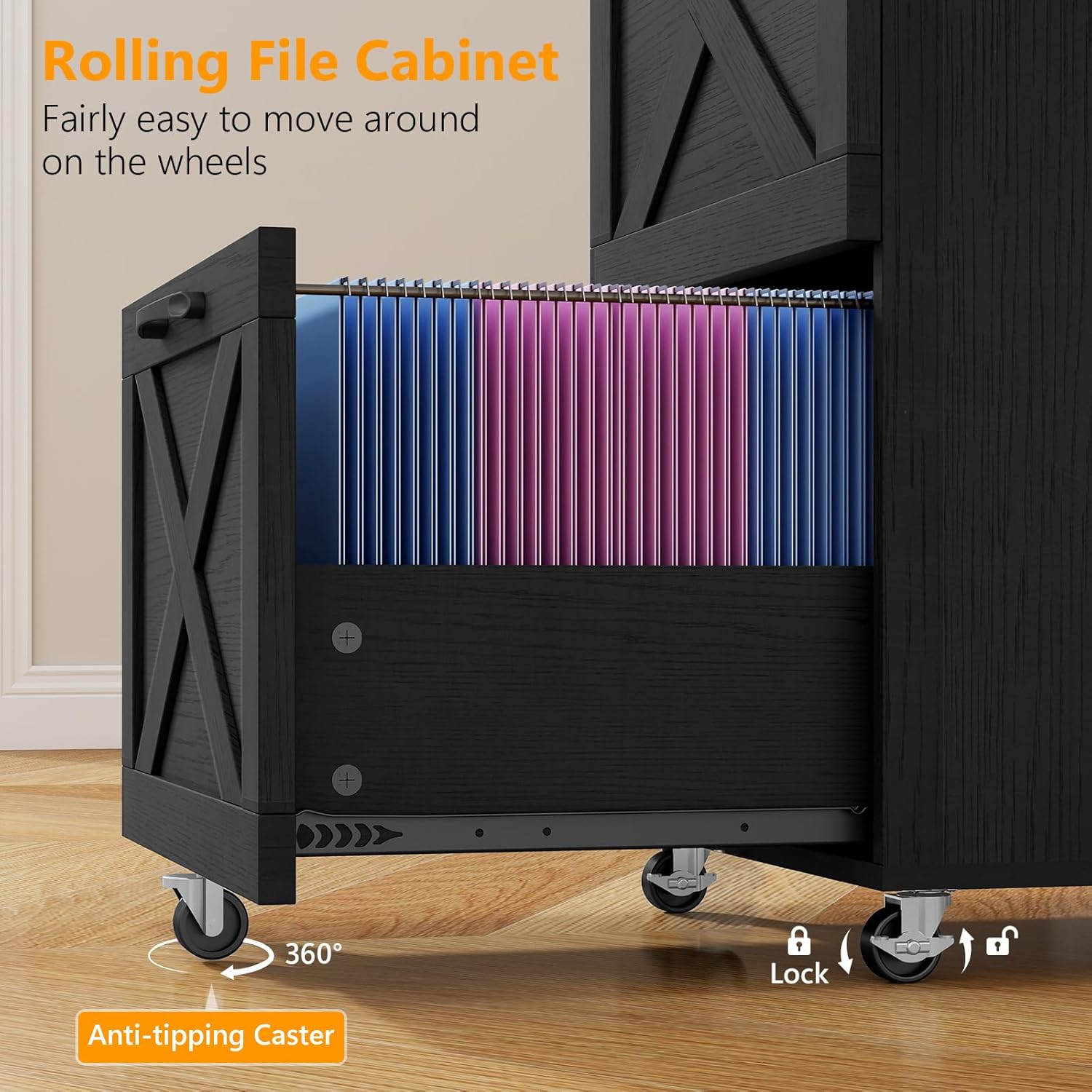 【Rolling Fill Cabinet】The wooden filing cabinet is equipped with 5 sturdy industrial rollers, which can be moved easily and freely. Among them, two casters can be locked so as to remain stable under the braking function. Whether it’s for transferring files among different areas in the office or using it in different corners of the home study, you can move it as you like. This greatly enhances the convenience of accessing files.