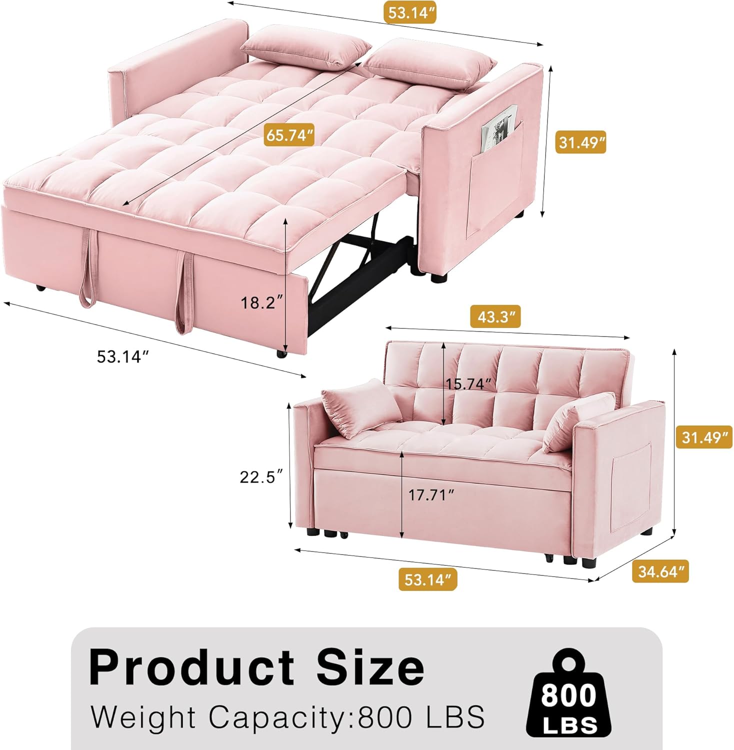 𝗦𝘁𝗿𝗼𝗻𝗴𝗲 𝗦𝘁𝗿𝘂𝗰𝘁𝘂𝗿𝗲: Crafted of sturdy wood frame, strong sinuous spring, high-density foam, soft velvet fabric,good foam-filled seats, soft 2 lumbar pillows make you feeling so comfortable to take a good rest. Maximum Weight Capacity is 800 lbs.