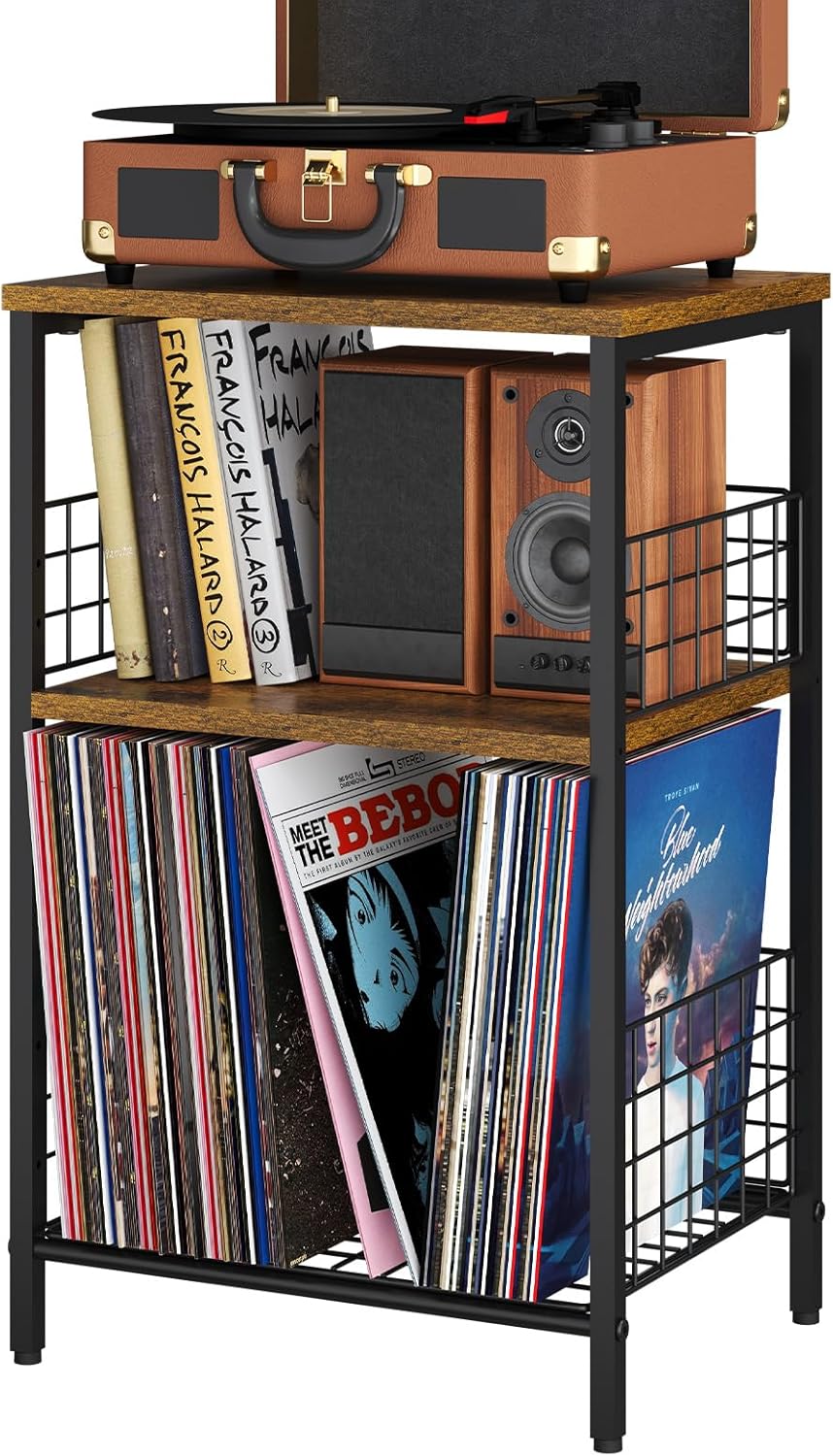 【3 Tiers Record Player Stand】This vintage-inspired stand features 3 tiers, including a spacious tabletop suitable for various record player sizes. Further, the 3rd open storage shelves can hold up to 100 albums, providing a categorized storage solution that combines artistry and practicality. 【Warm Tip】If the bottom is used for records, don’t install the front wire fence.