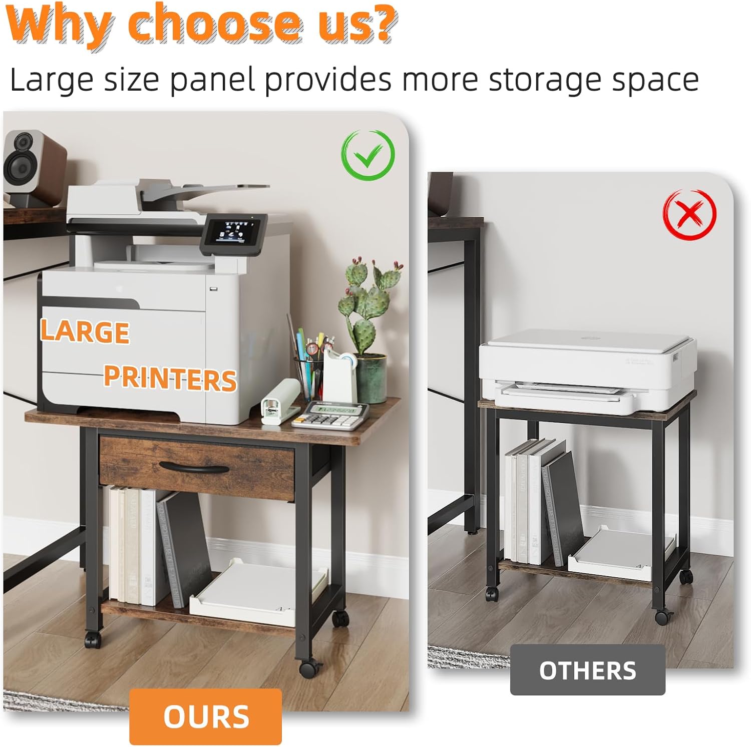 【2-Tier Printer Stand with Storage】Printer table with drawer provide a privacy space to place your desk office items. 2-Tier open shelves offer ample storage space for paper reams,file folder,ink cartridge and pen holder etc. Printer stand can ensure a clutter-free workspace and improved organization.