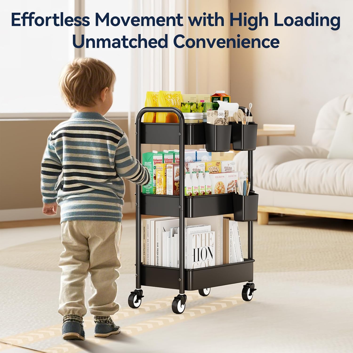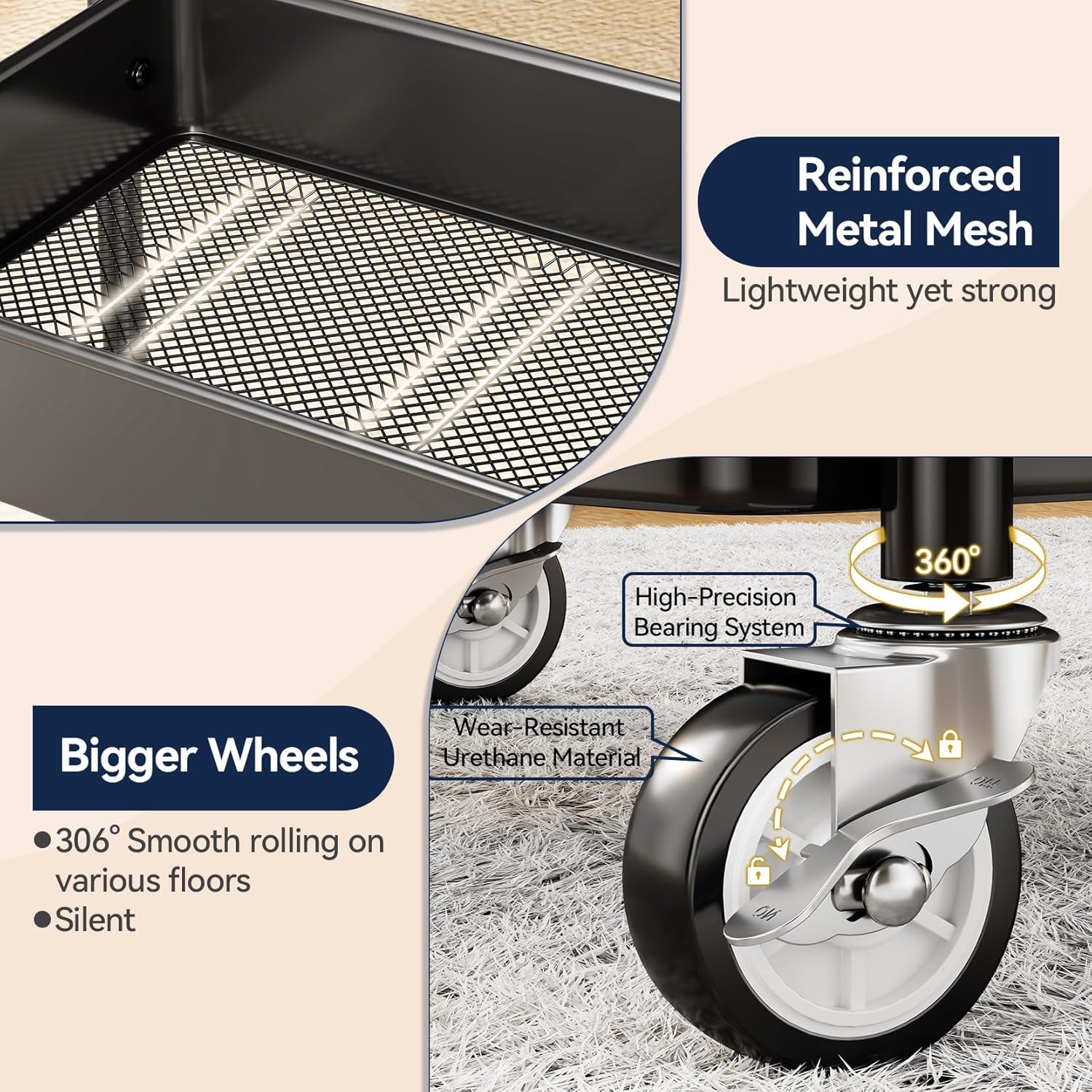 100% Metal, Sturdy and Durable, 66 LBS High Load-Bearing: The “H” shape dual column ensures the rolling carts with wheels are stable whether they are carrying heavy loads or moving. Made of durable steel, each basket of this 3 tier rolling cart with wheels can hold 22 pounds of items.