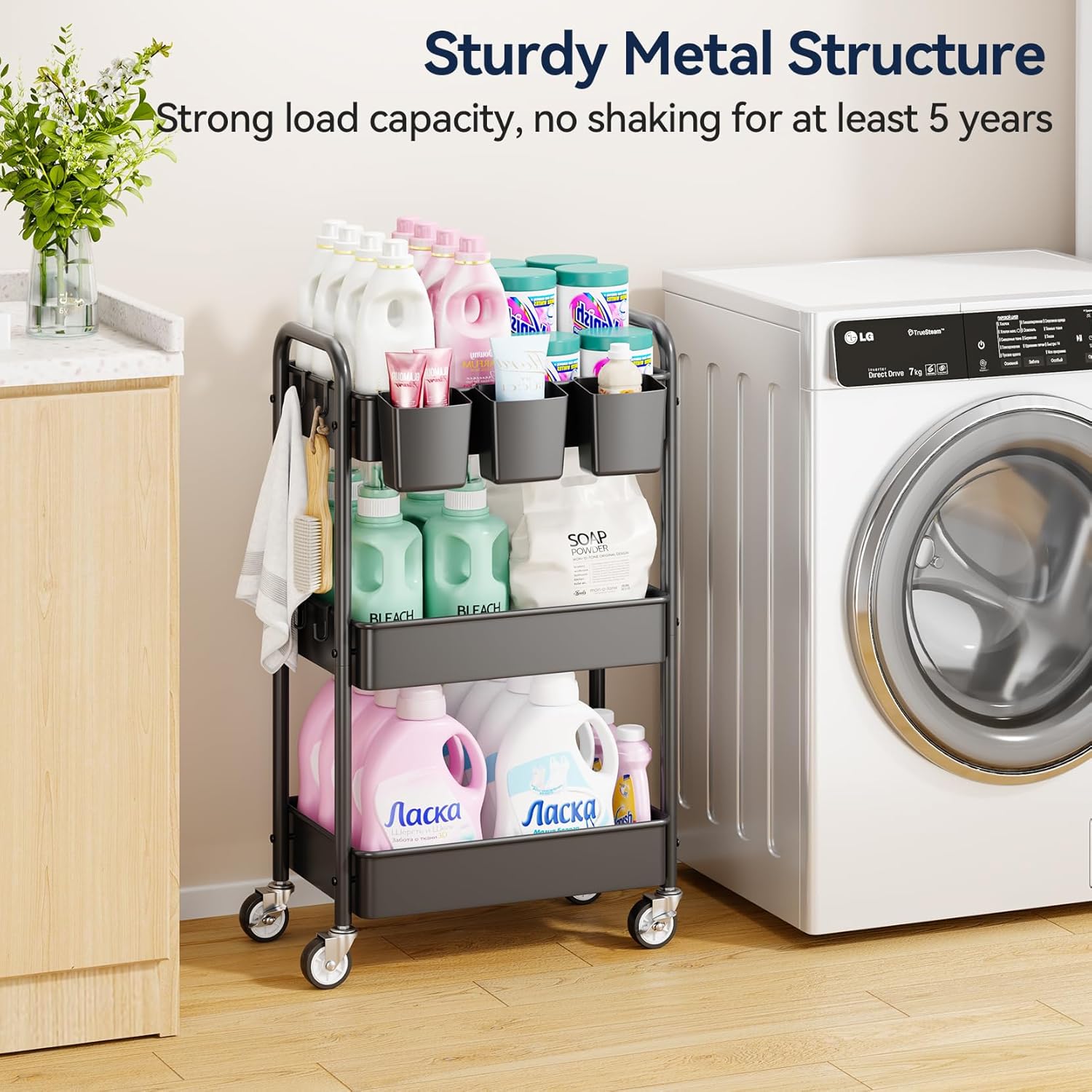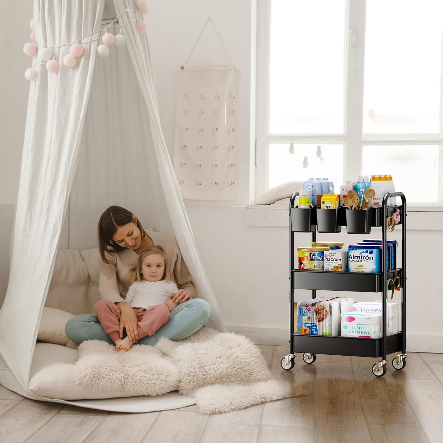 Expanded Storage Capacity, Multiple Uses: The metal cart features 3 baskets, suitable for use as a craft cart, cleaning carts, book cart, art cart, makeup cart, diaper cart, service cart, snack cart, etc. and the added 3 hanging cups and 4 hooks provide extra space for small items